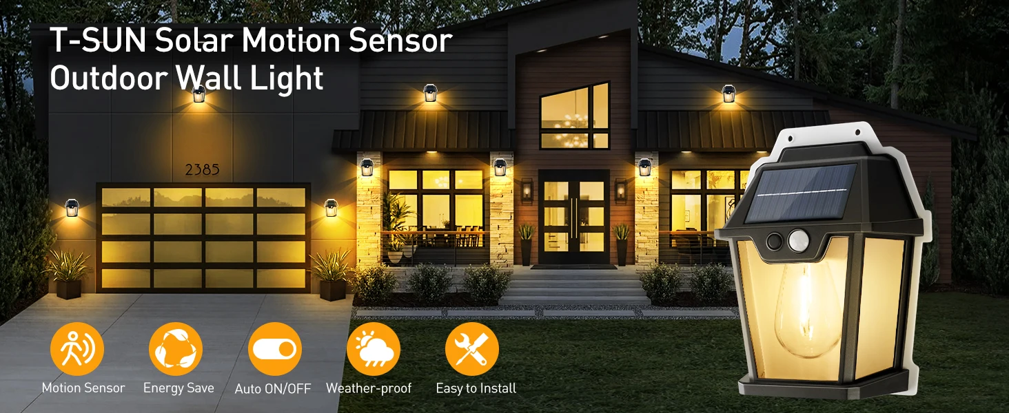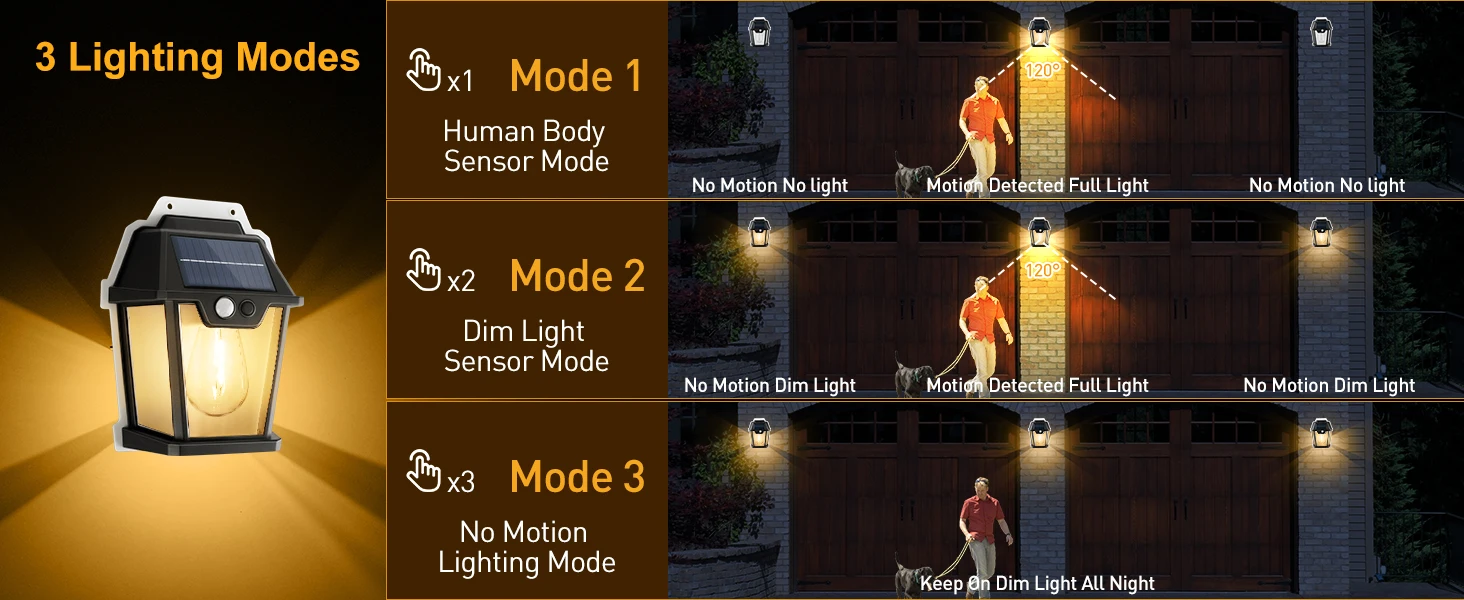 【Smart Motion Sensor】 The solar wall light has a built-in intelligent motion sensor that sensitively detects motion within a 120° angle within 8 meters. Press the on/off to switch 3 different modes: